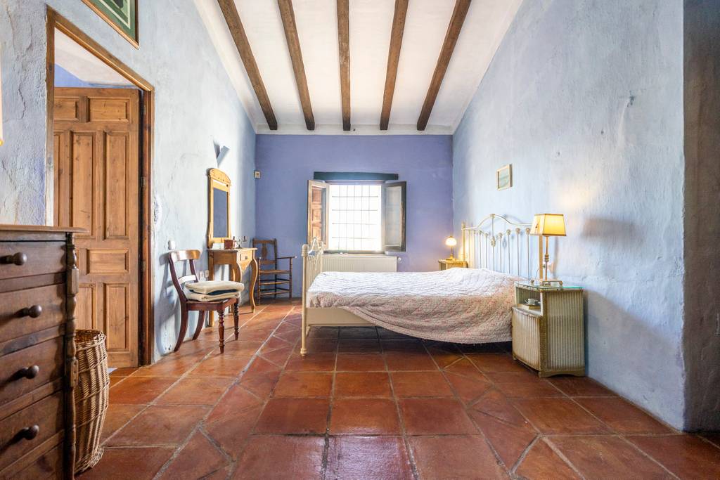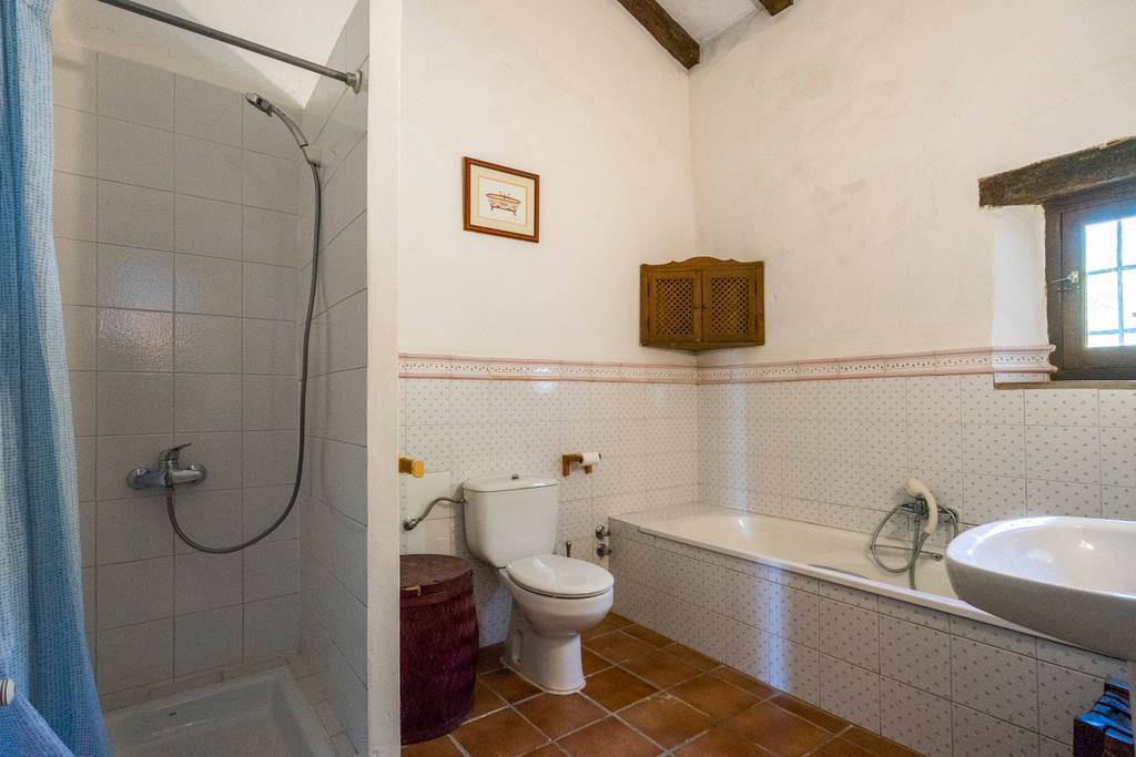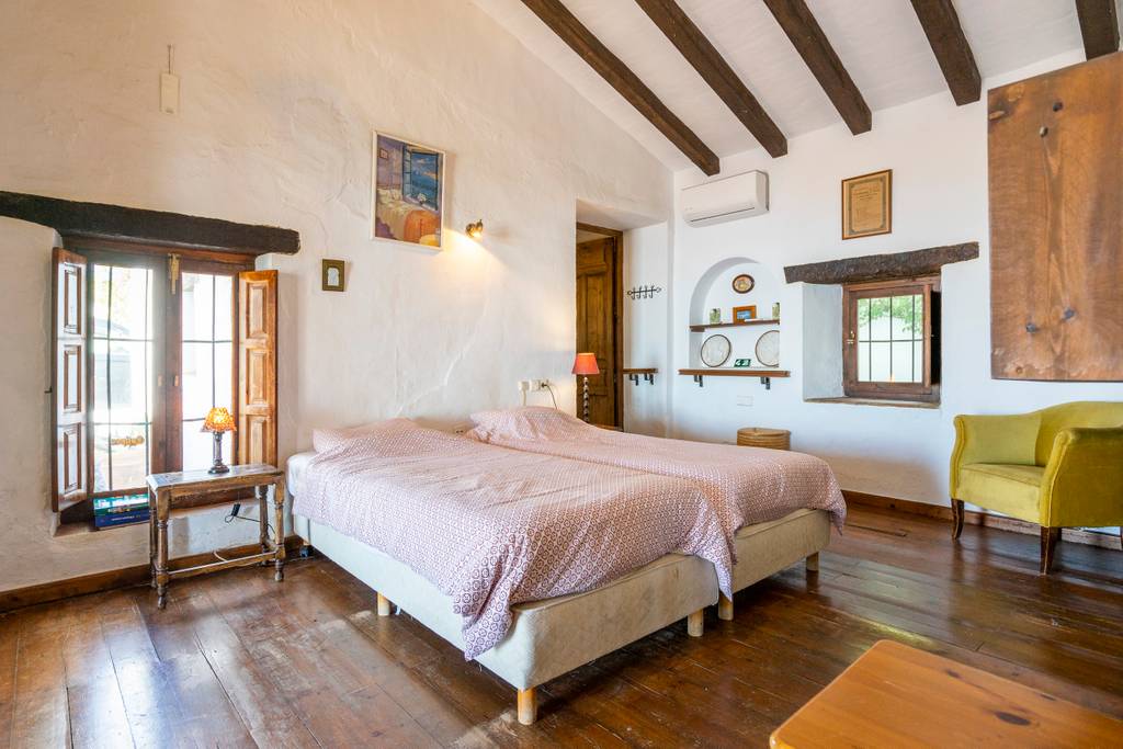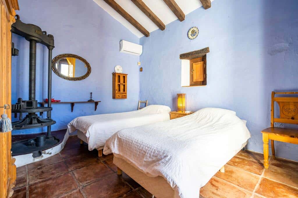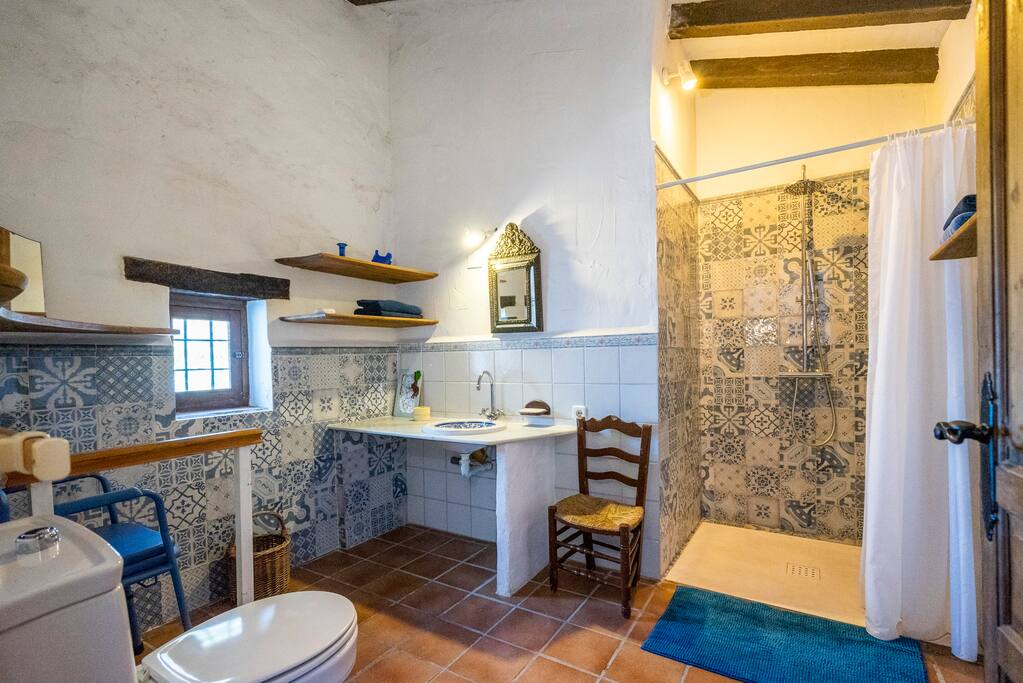 Next to the kitchen is a spacious, wheelchair-accessible master bedroom with a door to the terrace and an adapted en-suite bathroom with a shower. Adjacent to the living room is a separate bathroom with a bathtub and shower/toilet. There are two large bedrooms, one of which sleeps three, while the other features an authentic almond/wine press, which gives the room a very charming atmosphere. This bedroom has glass doors opening onto a terrace. The fourth bedroom is located in the old bodega, with a shower/toilet, two single beds, and a small sitting area. It has its own private sun terrace with plenty of privacy.