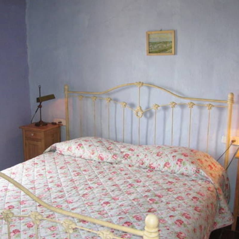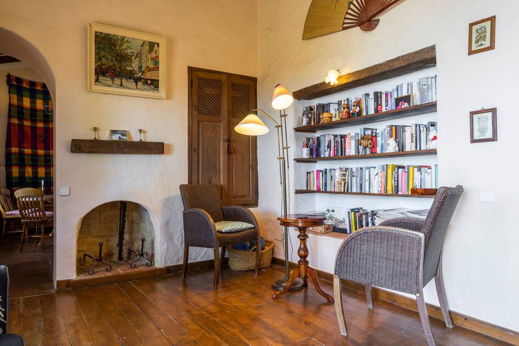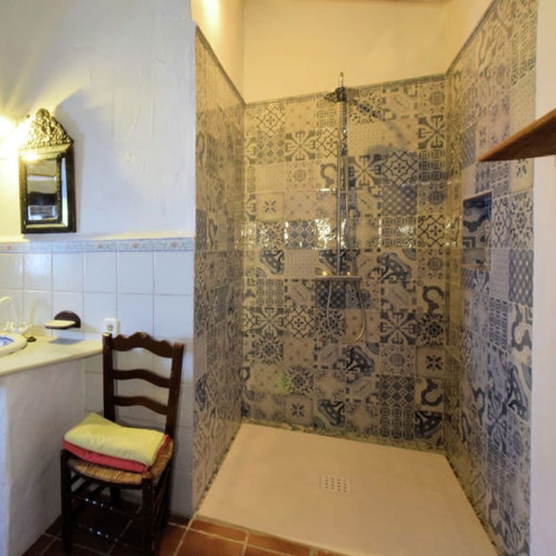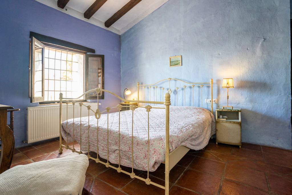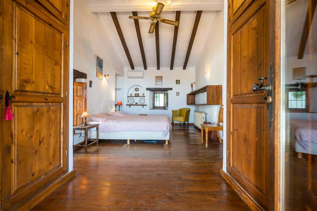 Next to the kitchen is a spacious, wheelchair-accessible master bedroom with a door to the terrace and an adapted en-suite bathroom with a shower. Adjacent to the living room is a separate bathroom with a bathtub and shower/toilet. There are two large bedrooms, one of which sleeps three, while the other features an authentic almond/wine press, which gives the room a very charming atmosphere. This bedroom has glass doors opening onto a terrace. The fourth bedroom is located in the old bodega, with a shower/toilet, two single beds, and a small sitting area. It has its own private sun terrace with plenty of privacy.