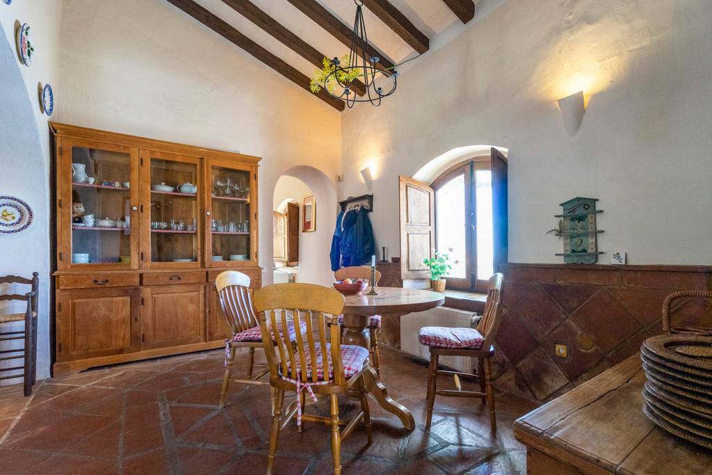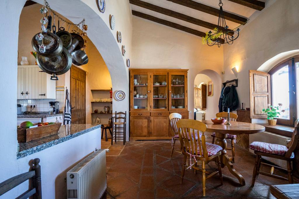 From the main entrance, you enter the living room with a stylish seating area by one of the two fireplaces. French doors open onto the terrace, and there’s a stereo/CD player, satellite TV, and a DVD player. Adjacent to the living room is a spacious dining room with an antique dining set, separated by a wide archway. The spacious kitchen-diner features a large wooden dining set, ample storage space, and all the necessary appliances, including a fridge/freezer, oven, hob, dishwasher, microwave, kettle, juicer, and washing machine. All kitchenware is provided, but if you feel something’s missing, the owner will be happy to provide it.