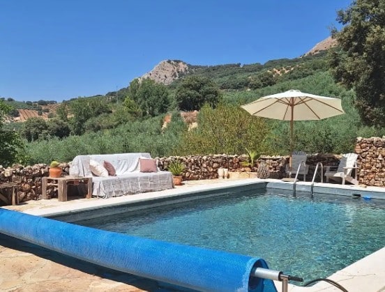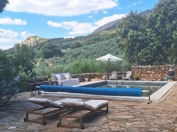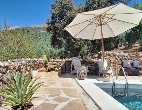 Het zwembad is privé en heeft een afmeting van 8×5 meter, de diepte is overal 1.50 m. Rondom het zwembad vind je diverse ligbedden, stoelen en een loungebankje. Parasols zorgen voor de nodige schaduw. Bij het zwembad kun je genieten van het mooie uitzicht op de bergen en de natuur.