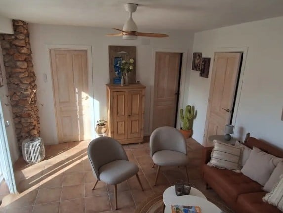 De woonkamer grenst aan de keuken en is bereikbaar met 2 traptreden. In de woonkamer vind je een TV en elektrische verwarming en een plafondventilator. De openslaande deuren van glas geven veel licht en een goed uitzicht naar de tuin.